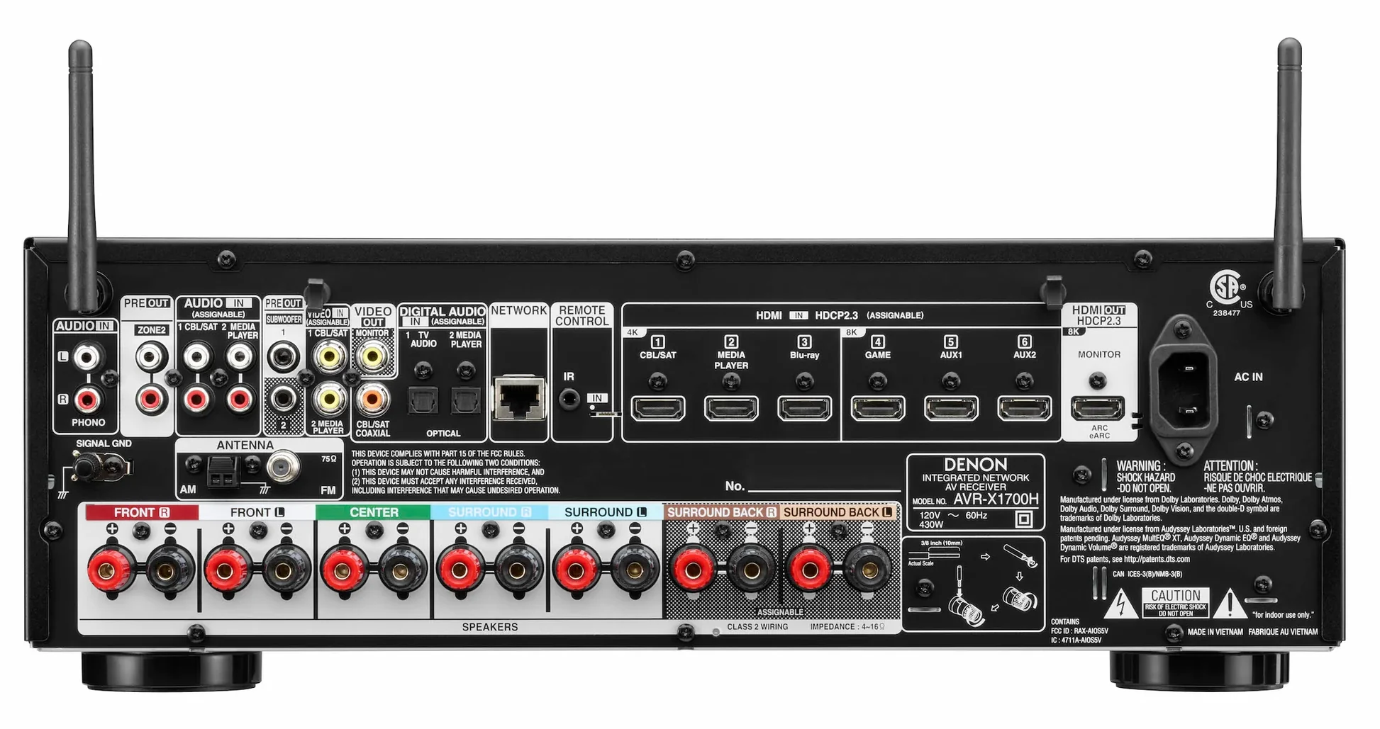 The Denon AVR-X1700H supports a 7.2 channel setup, providing immersive audio for your home theater.
