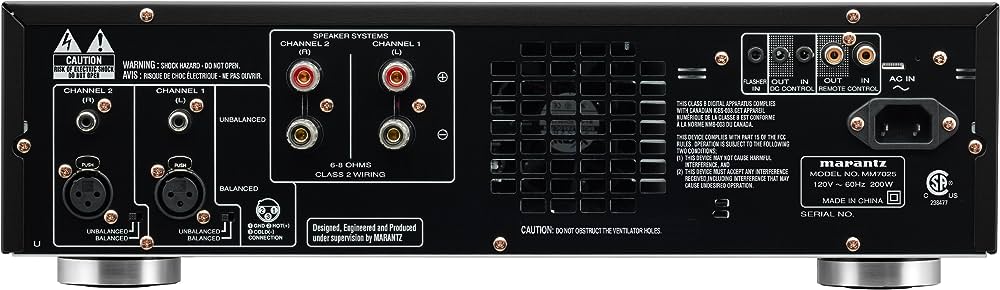 The Marantz MM7025’s heavy-duty, gold-plated, four-way binding posts accept virtually any choice of loudspeaker cable The amplifier is less than 14” deep from the front panel to rear speaker terminals. This lets you place the MM7025 almost anywhere – in a cabinet or on a shelf. Selectable single-ended and balanced inputs assure easy connectivity in any system. This is Marantz quality at its best.