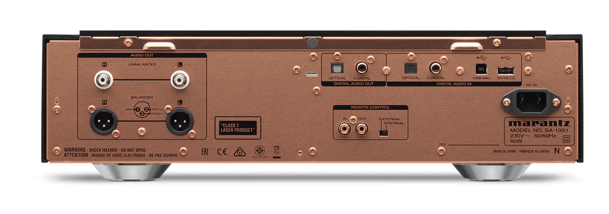 The Marantz SA-10 is a visual and tactile masterpiece, featuring an elegant and robust construction that harmonizes form and function. The sleek, brushed aluminum chassis exudes sophistication, while the large porthole display showcases the player's cutting-edge technology. Every detail is meticulously considered, making the SA-10 a striking addition to any audio enthusiast's setup.